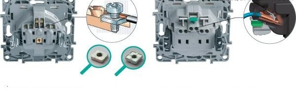 Според метода за закрепване на проводниците към захранващите клеми, превключвателите са разделени на устройства с винтова скоба на проводника и устройства с механизъм за бързо затягане за фиксиране на проводниците.