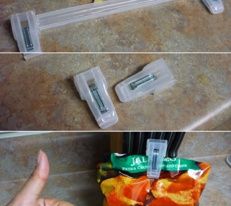 Когато купувате различни зърнени храни, сладкиши, млечни и други продукти в меки контейнери, трябва предварително да помислите как да го затворите, така че продуктите да се влошат. Понякога има толкова много опаковки, че специалните скоби просто не са достатъчни. В този случай можете да използвате обикновени пластмасови щифтове от ненужни закачалки.
