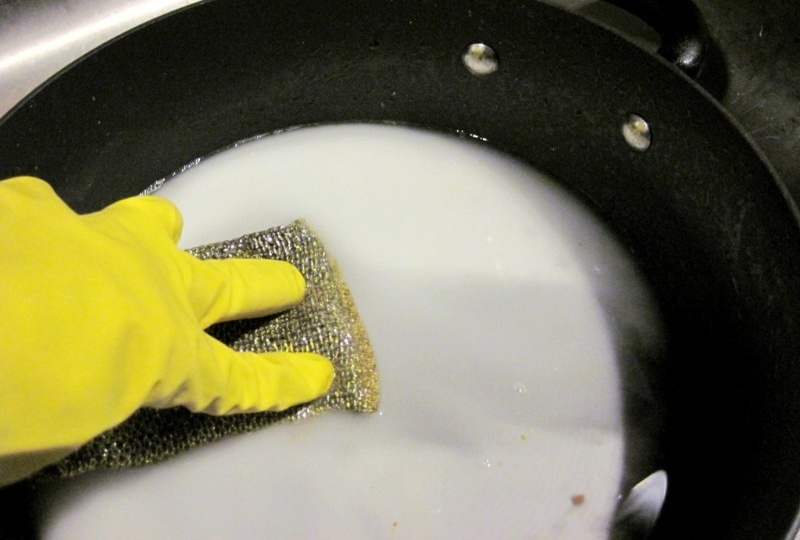 Вместо прах, можете да използвате не по-малко ефективна комбинация от сода за хляб и сапун за пране. За целта настържете 30 gr. сапун, смесете го със същото количество сода и внимателно разтворете тази смес в 1 литър гореща вода. Потопете мръсните уреди в горещ разтвор и след 15-20 минути ги почистете по всякакъв удобен начин. За да направите това, можете да използвате обикновена гъба или кърпа от твърд метал, както е описано в предишния параграф.