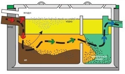 Септична яма е конструкция, предназначена за пречистване на отпадни води. Схемата на устройството му включва наличието на многокамерна система. Канализация влиза в първия резервоар по тръбопровода от къщата. Това е утайка. Претърпява бактериално разлагане на отпадни води. В някои устройства, най-често промишлено производство, тук са инсталирани специални съоръжения, които произвеждат първична филтрация на замърсена вода. Разлагането на изтичащите води се извършва под въздействието на безкислородни или анаеробни бактерии. Те превръщат течността, постъпваща в резервоара, в пречистена вода, газ и минерална неразтворима утайка или утайка.