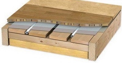 В дървени къщи често се използва методът на подови настилки за подреждане на подгряване с вода, което ви позволява да направите без полагане на бетонна замазка