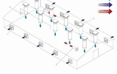 Смесена вентилационна схема се използва в региони с рязък спад на температурата през цялата година. Подобна инсталация се справя с проветряването на кокошарника, изцяло облицована с редове от клетки до 5–6 слоя във височина.