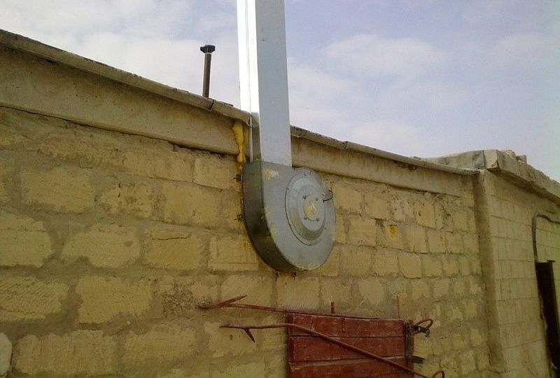 - Фиксирайте изходната тръба в получения отвор, като гарантирате, че надморската височина над горната точка на сградата е над 0,5 м. Инсталирайте дефлектор в горната част на изходната линия, ускорявайки изпускателната тръба на гаража.